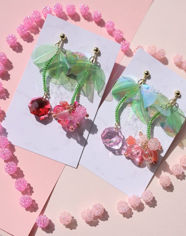 弾ける可愛さの春作品『popcorn cherry』シリーズにハーフタイプが登場❀ よりフレッシュにさくらんぼの茎の部分をグリーンのビーズ、葉っぱをスパンコールで表現しました。 左側のクリスタルは美しいカットで、日差しが強くなるこれからの季節にぴったり! 春モード全開のキラキラ可愛い華やかな耳飾りに仕上がっています❀ 一粒一粒質感や色味にこだわって選んだ可愛いビーズ達をお楽しみください✨ もちろんこちらもつけ心地抜群の軽さです♪ 春先のお耳元をキュートに彩ってくれる『popcorn cherry 1/2』をお1ついかがですか?♡ ❀色味が淡いsakura pink(写真2枚目〜6枚目)と、濃い色味のcherry pink(写真8枚目〜12枚目)の2色展開です。ご希望のお色味を選択して下さい。 写真は、着用画像以外は日の当たる場所で撮影したものです。 ⚠耳に直接触れる部分の金具は全てサージカルステンレスですがその他パーツは金属製の物を使用しております。 こちらはイヤリングとピアスでお選び頂けます。 『金具の選択』よりお選びくださいませ。 長さ:約5.5cm