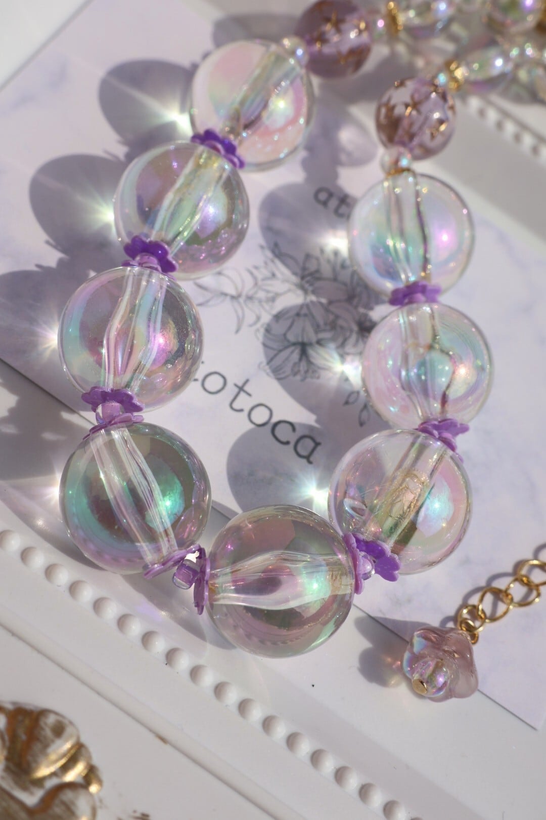 しゃぼん玉のようなオーロラビーズを連ねてインパクトのあるチョーカーネックレスを作りました。