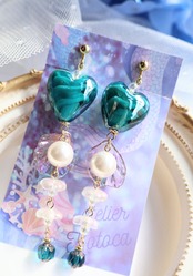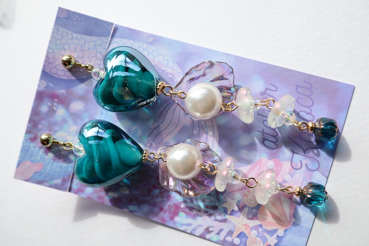 海のような青緑色のランプワークハート型ビーズがぱっと目を惹く華やかな耳飾りです❁