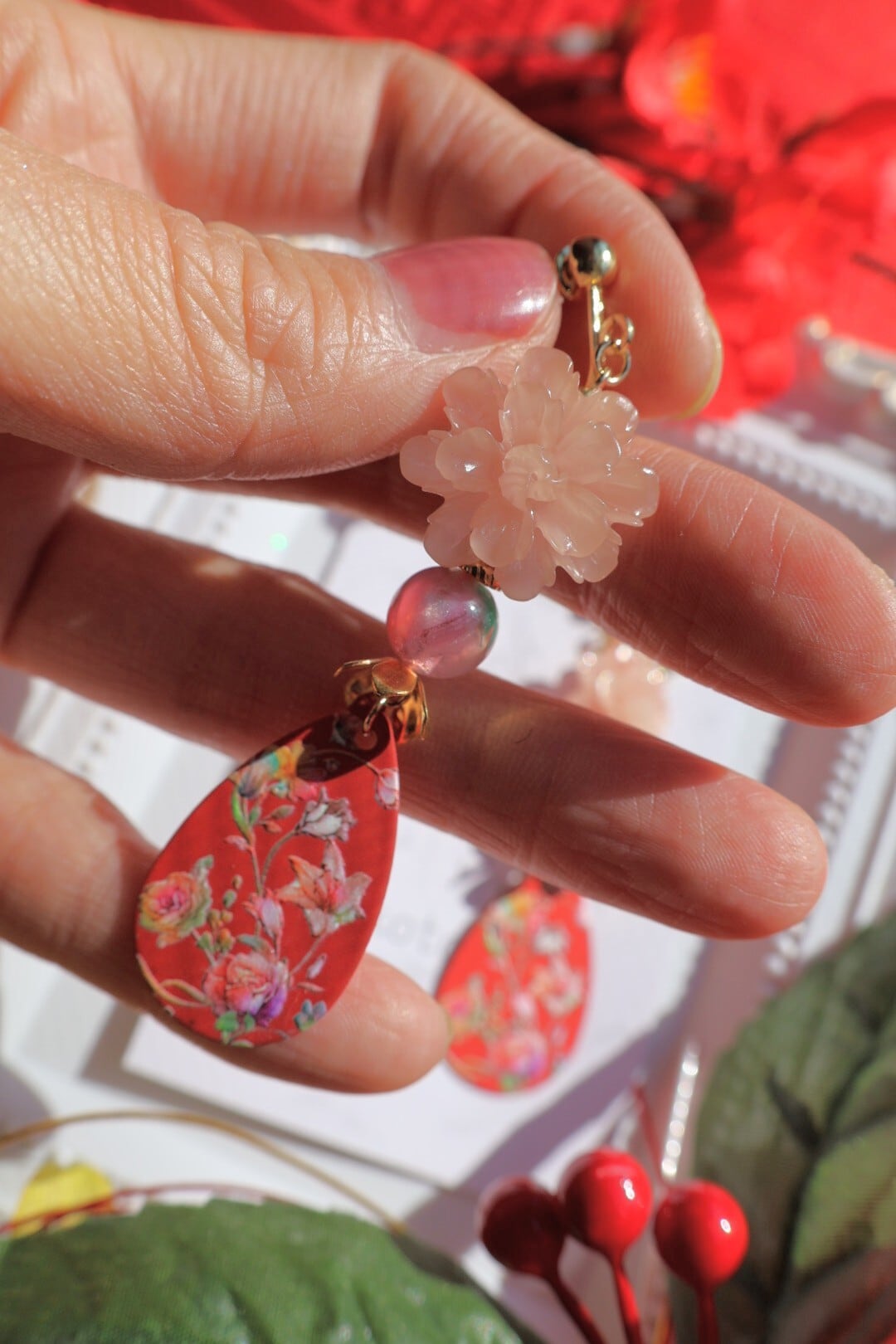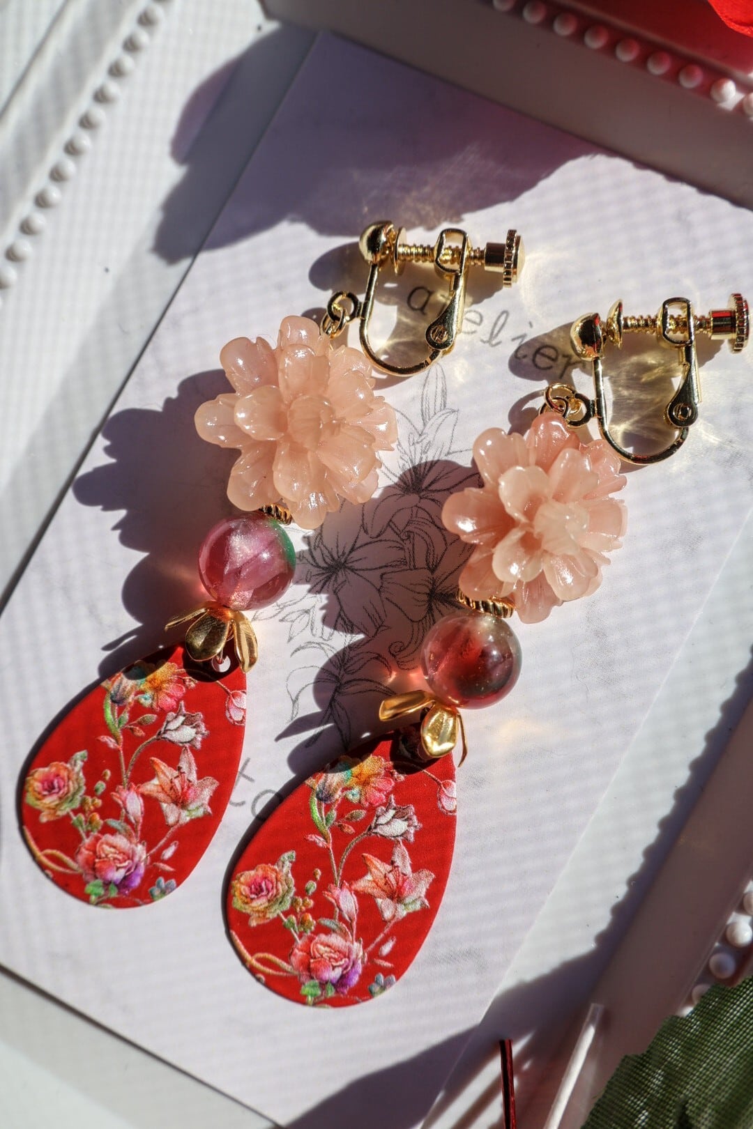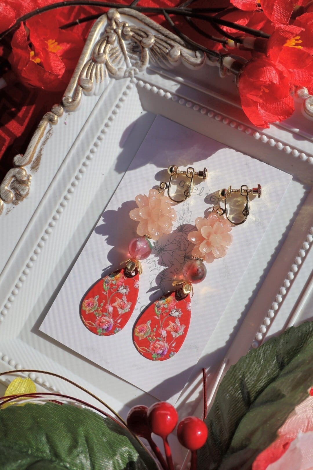 サーモンピンクのダリアと、百合や薔薇など幾つもの花々が描かれている真っ赤なアイアンプレートがパッと目を惹く耳飾りです。