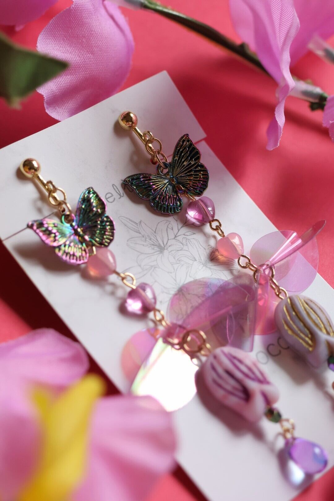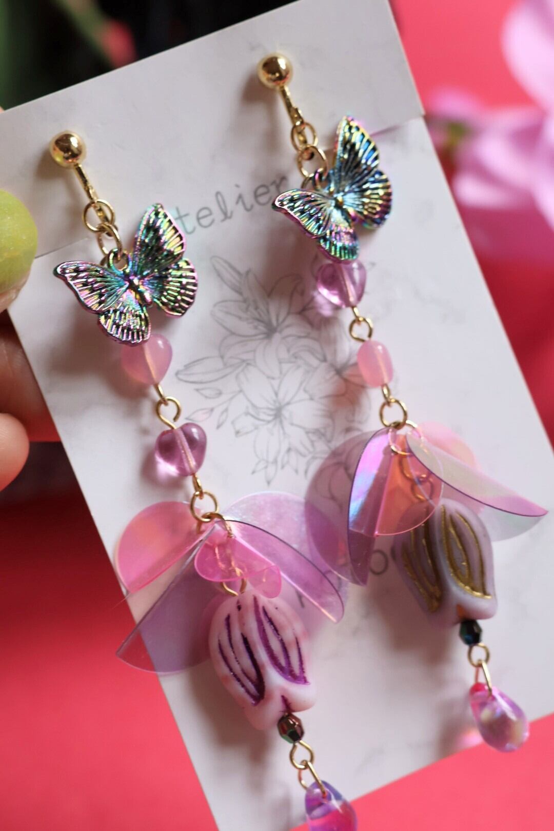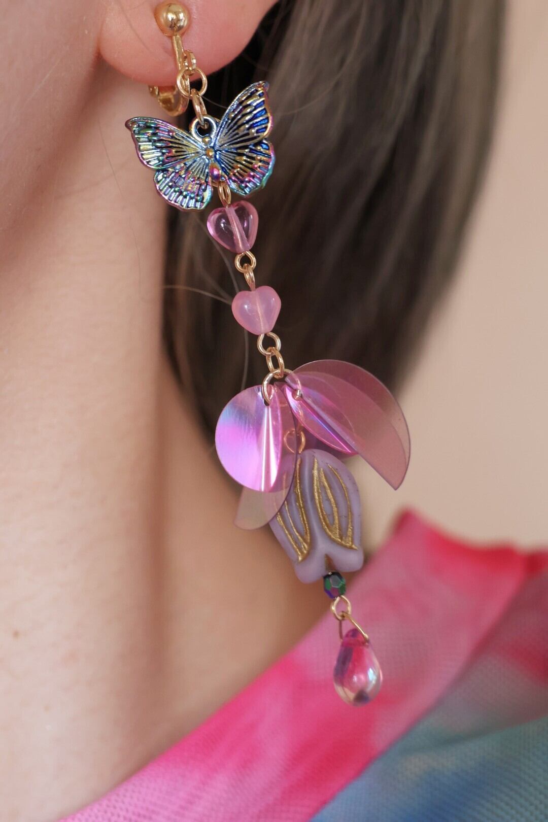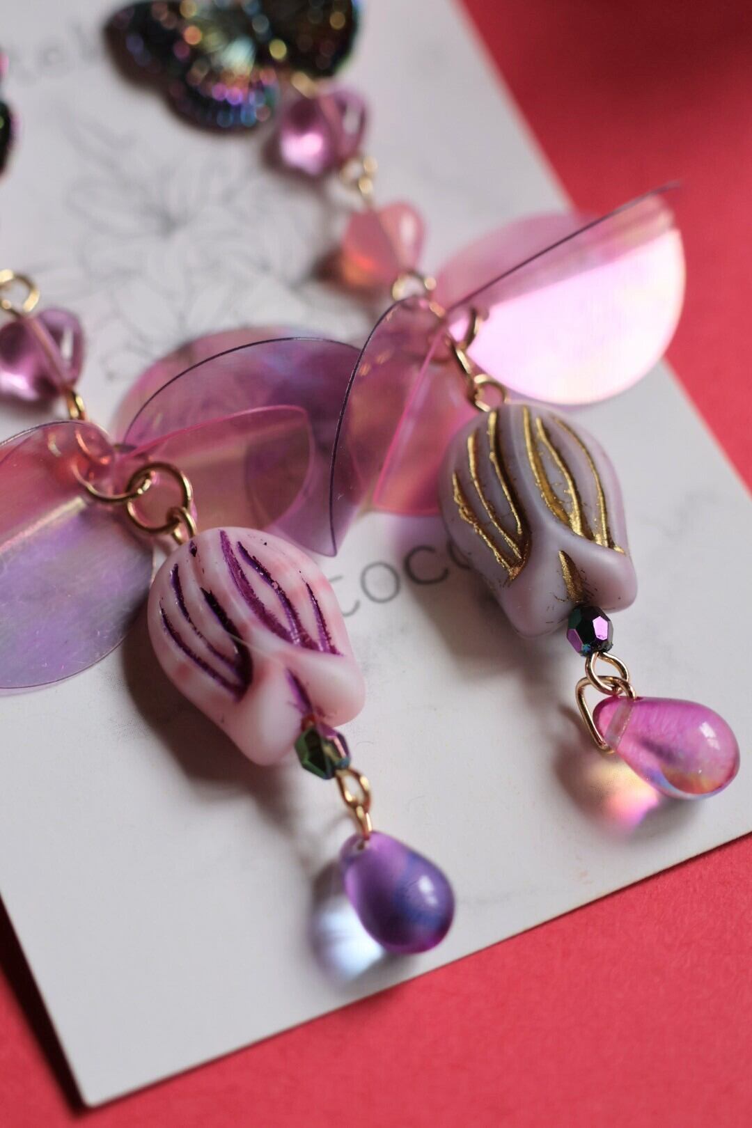 ピンクと紫の毒っ気のある色合いと、ハートやスパンコールの可愛らしいビーズの組み合わせが魅力の耳飾りです❁
