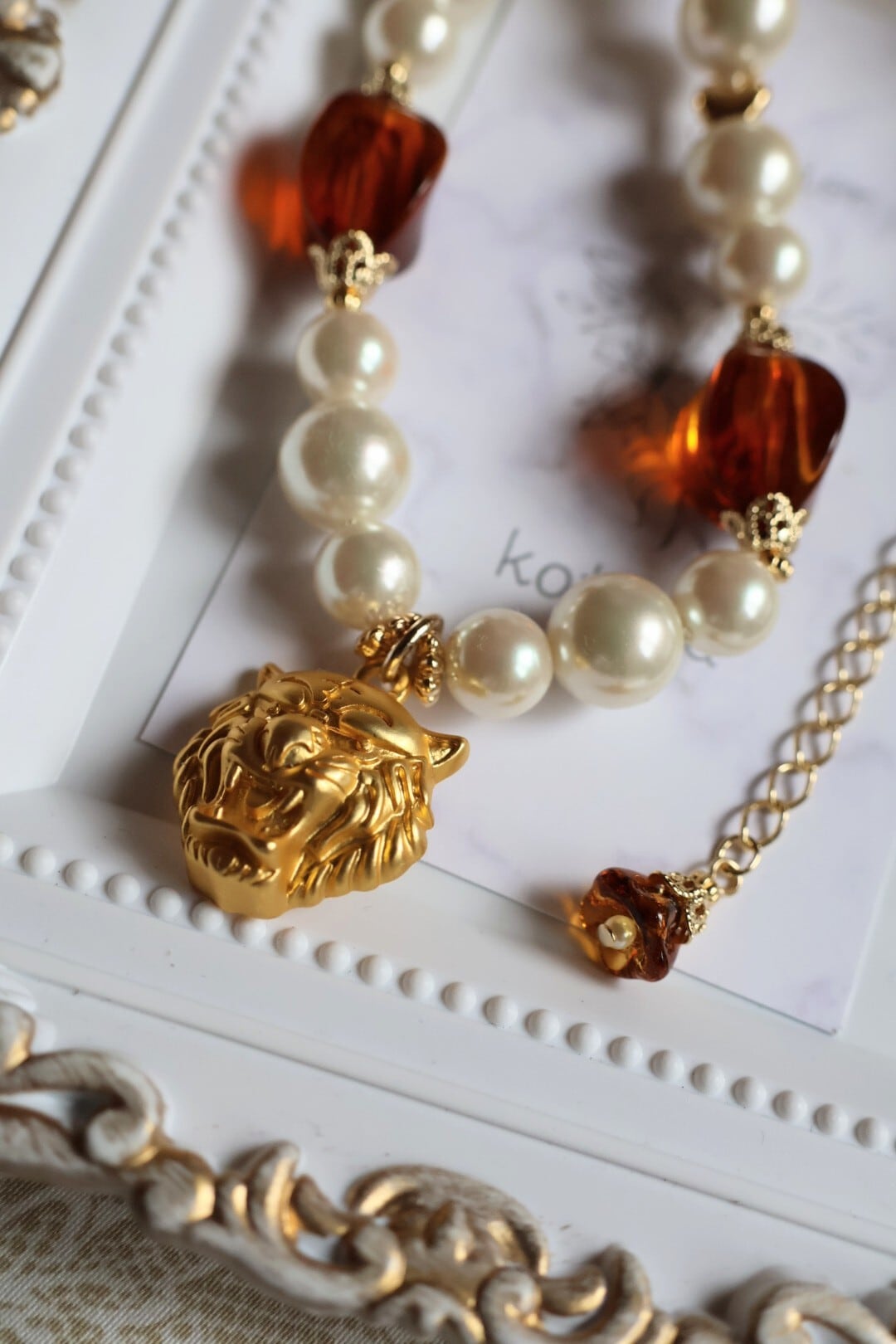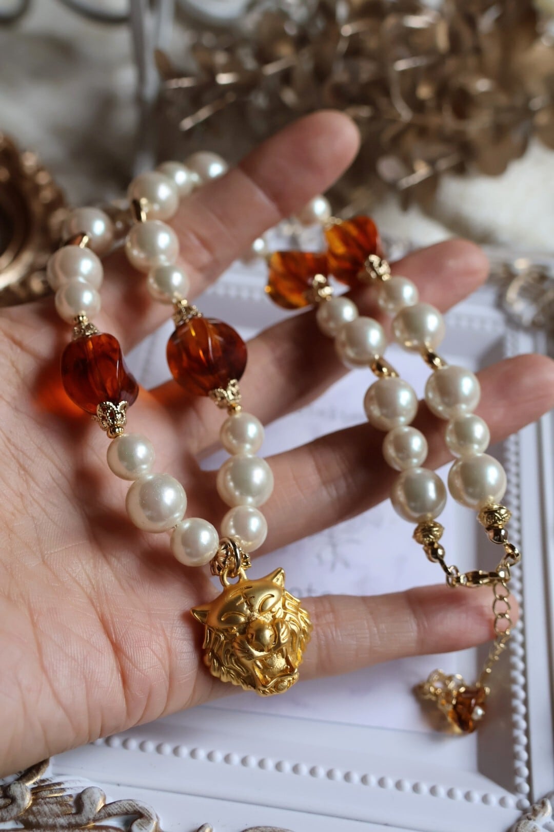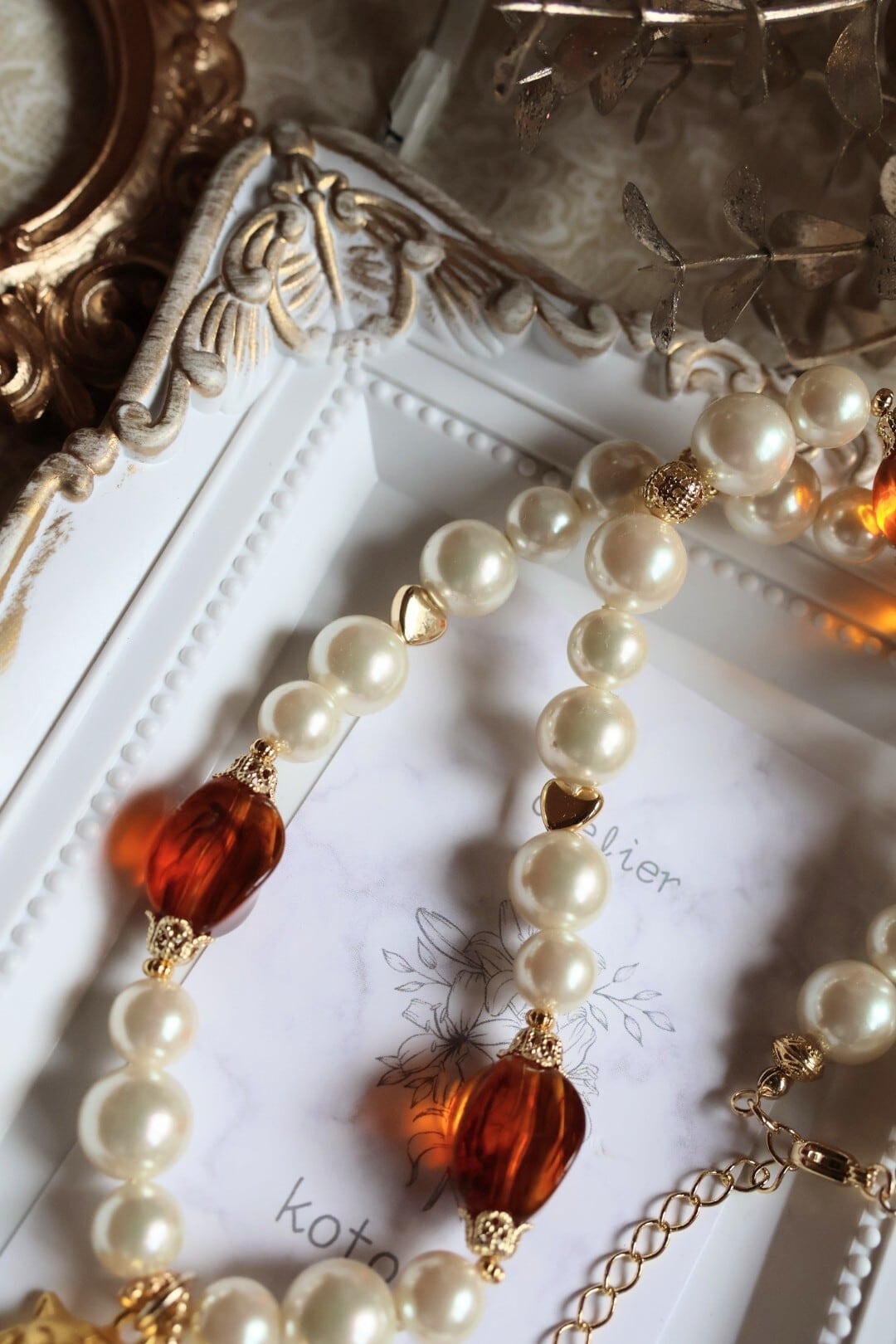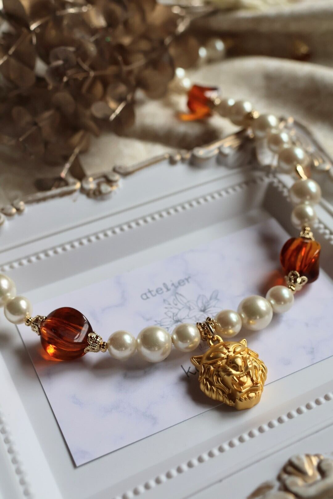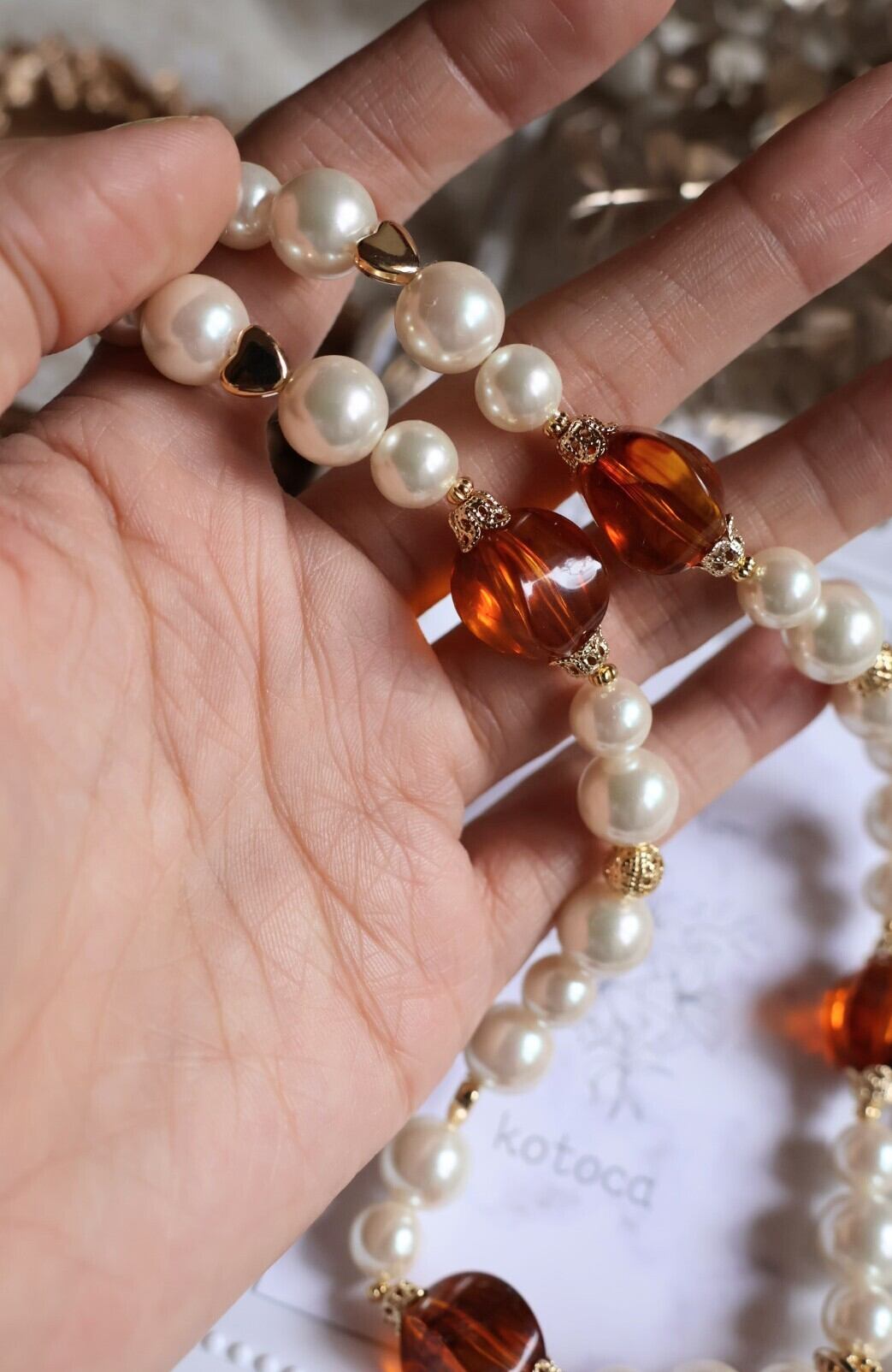 変化をつけてパールの大きさを変えてみたり、ごろんと大きめのべっ甲色ビーズを使ってみたり、小さなゴールドのハートが隠れていたりと遊び心盛りだくさんです❦