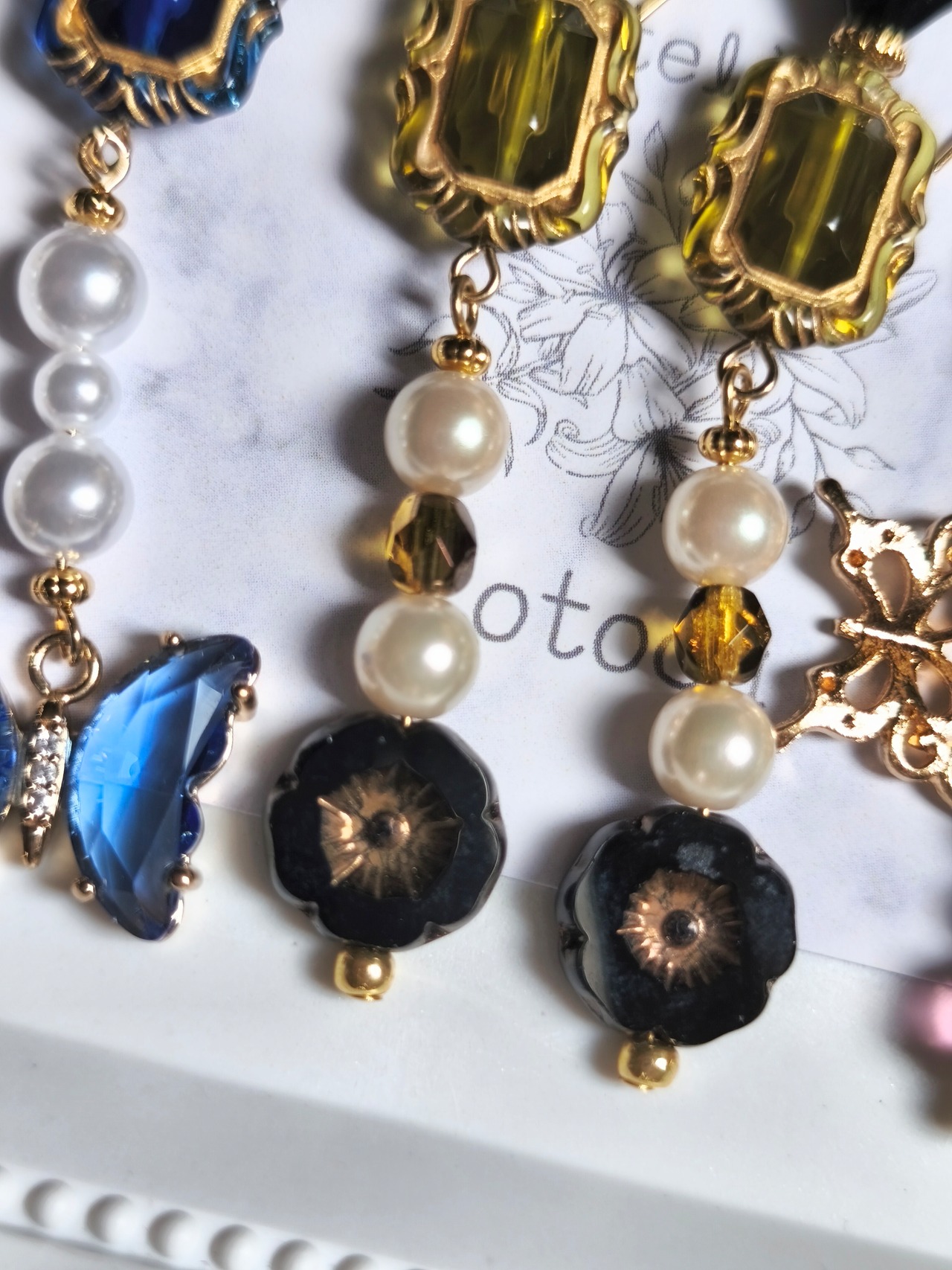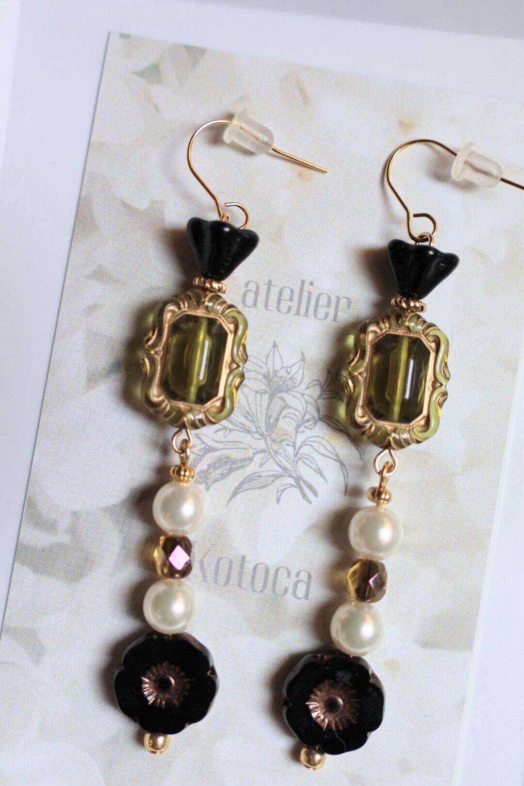 こだわりポイントはパールの間に挟んだトパーズ色のチェコビーズと、柔らかい雰囲気を引き締める黒のフラワービーズです。