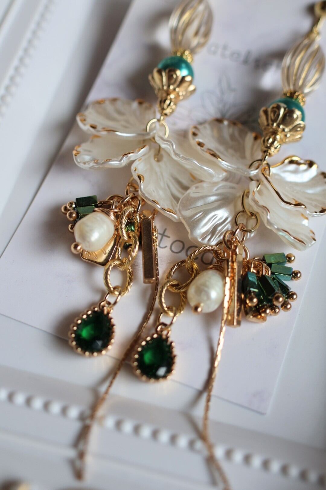 グリーン×ゴールド×ホワイトの色合いは華やかでありながらも上品さやナチュラルさも兼ね備えており、さまざまなスタイルに合わせて使い頂けるかと思います。