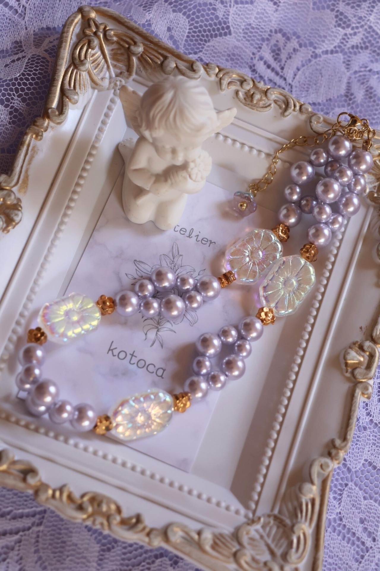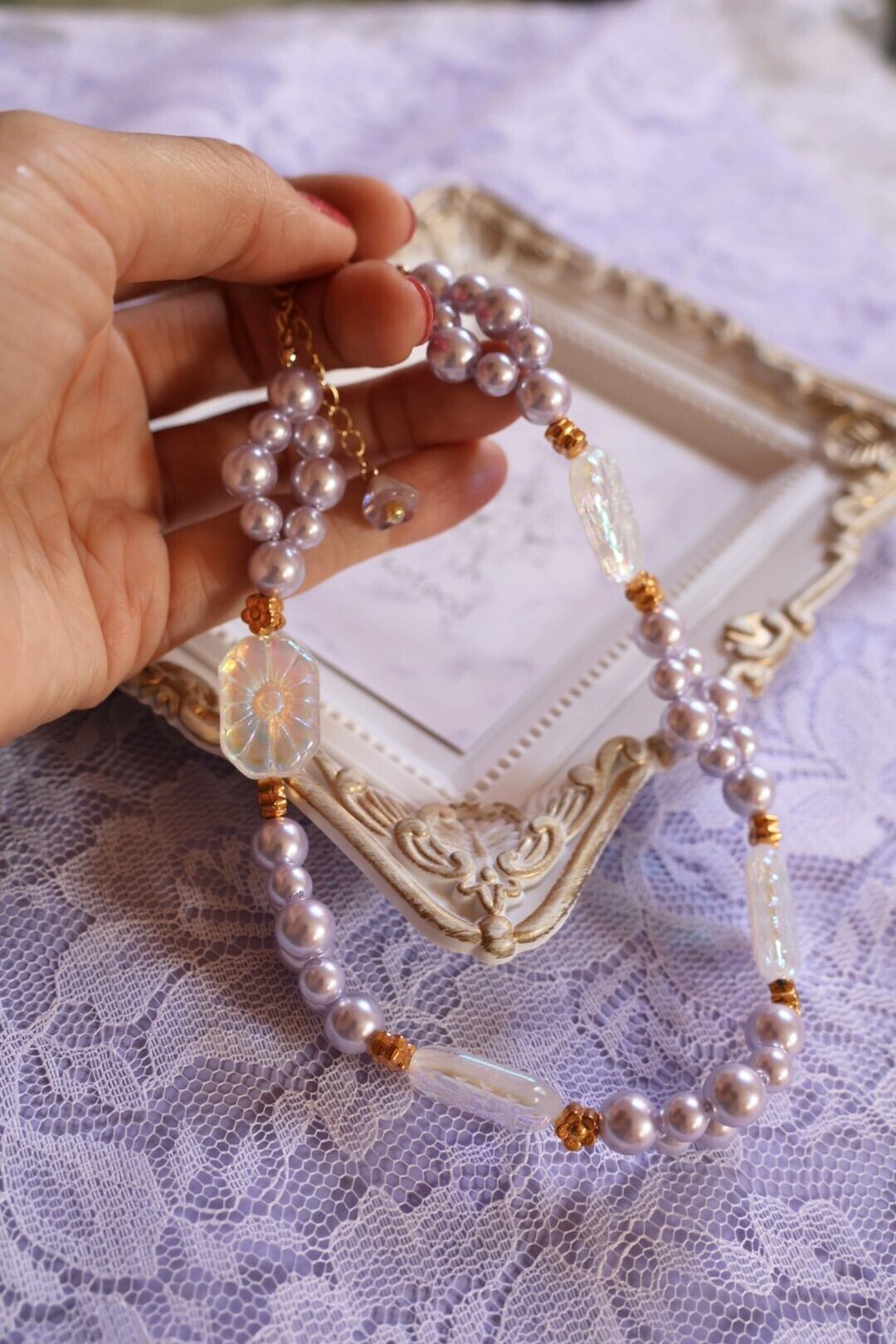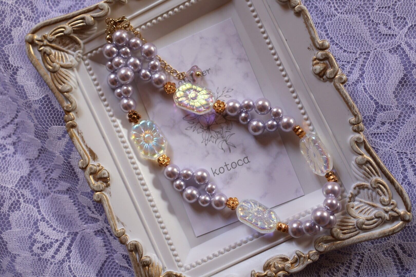 ラベンダーのパールと透明の石鹸のようなビーズの組み合わせが優しさと可愛らしさを感じさせます。
