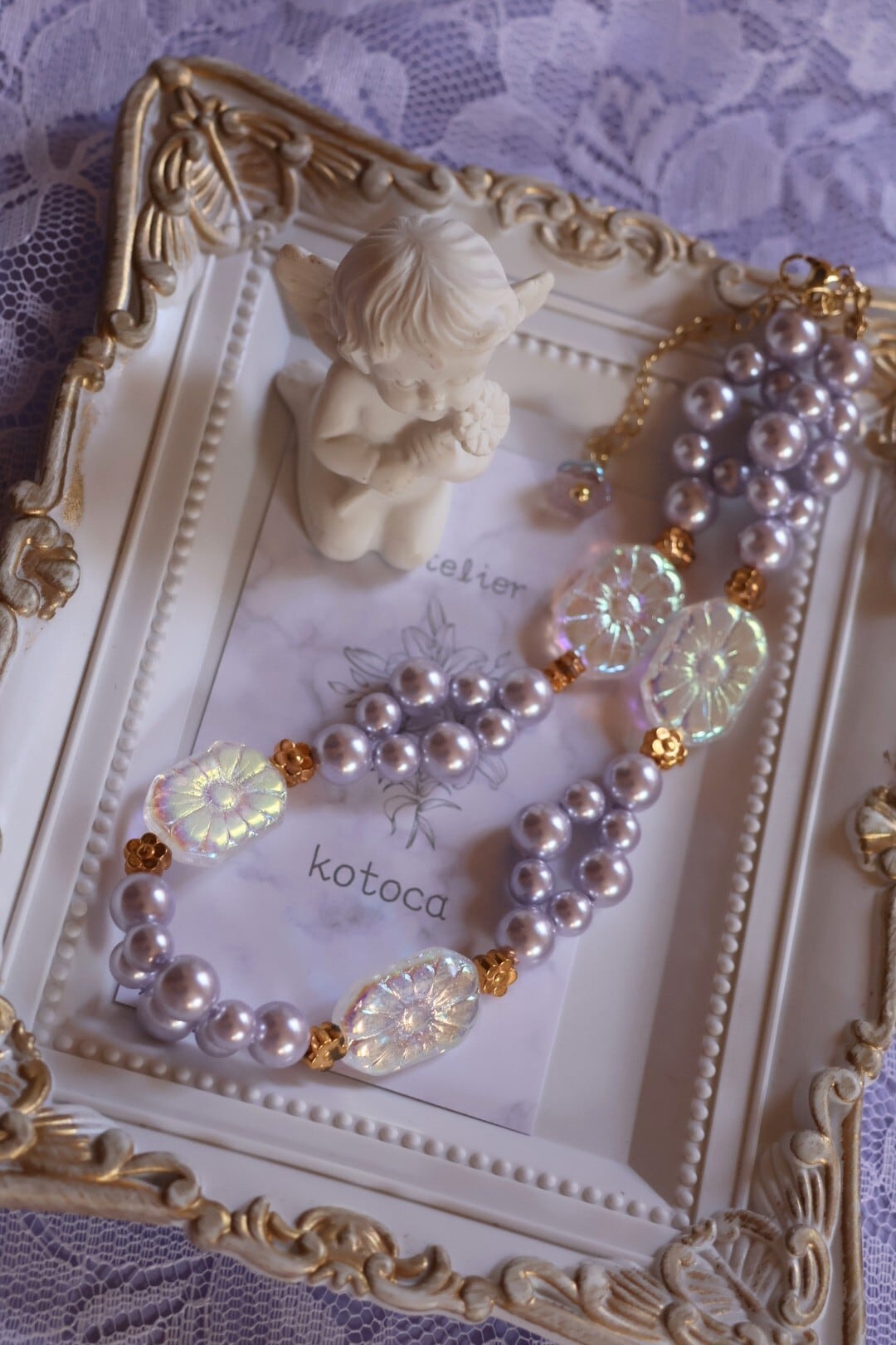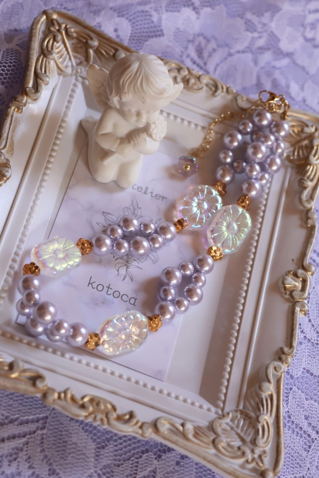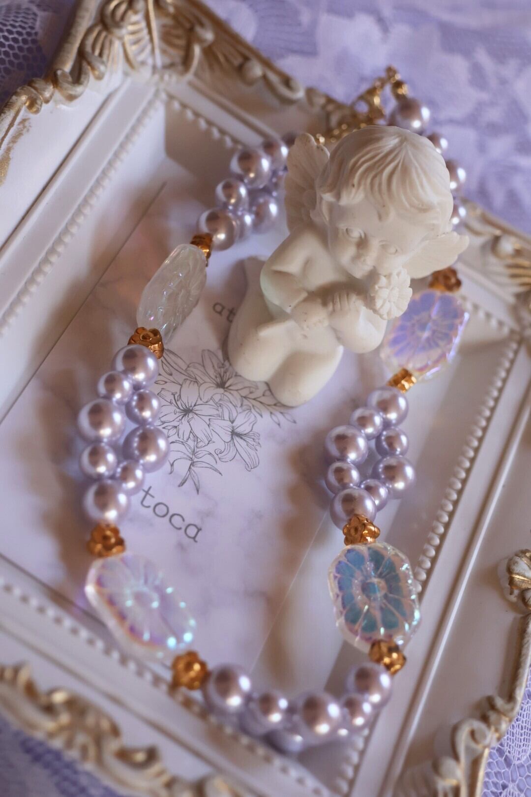 ラベンダーのパールと透明の石鹸のようなビーズの組み合わせが優しさと可愛らしさを感じさせます。