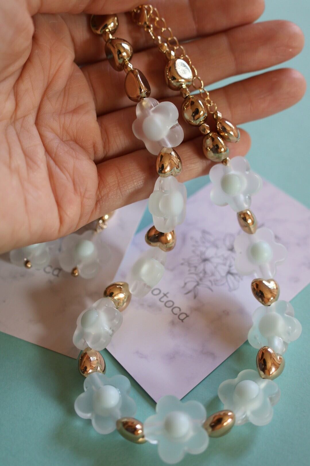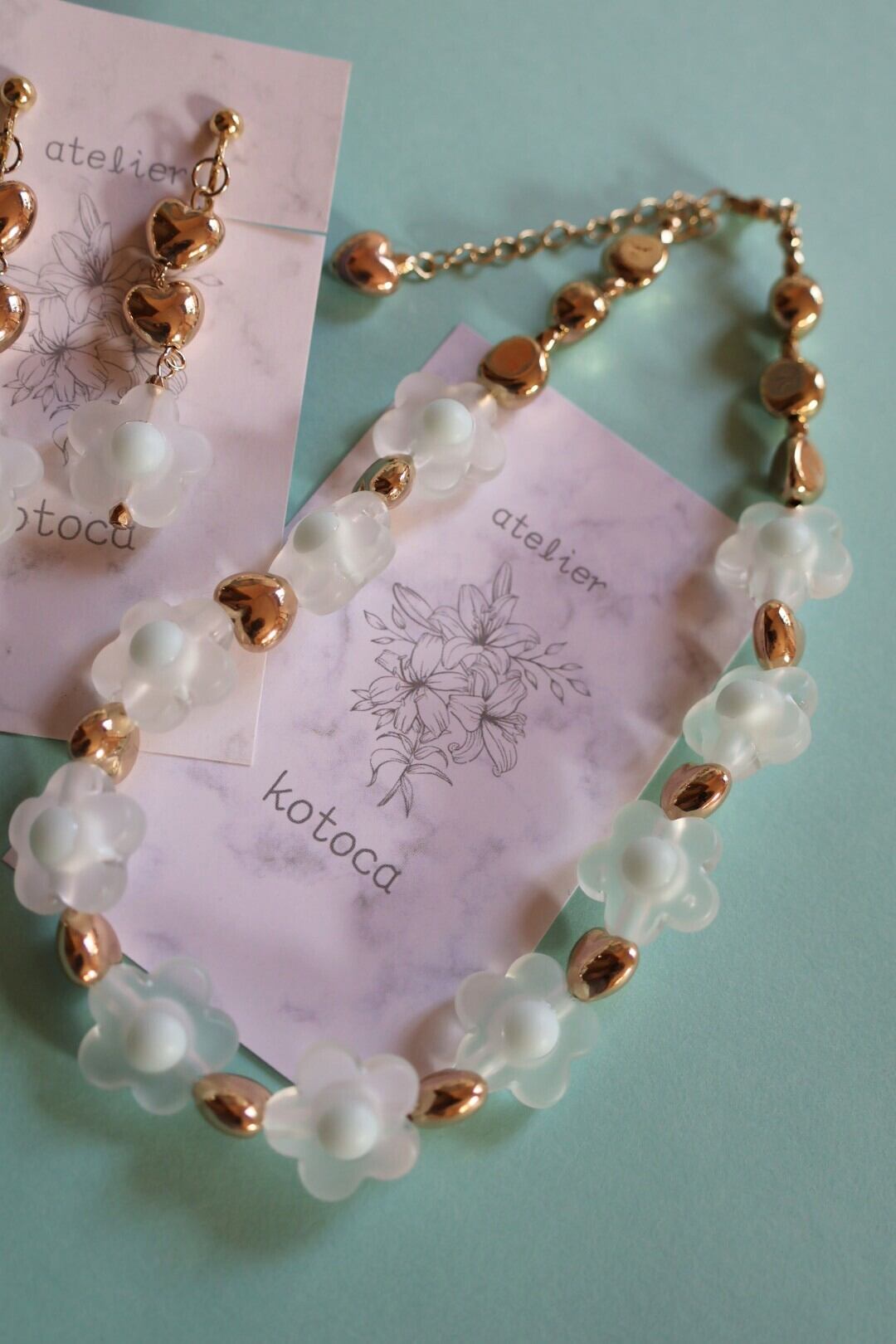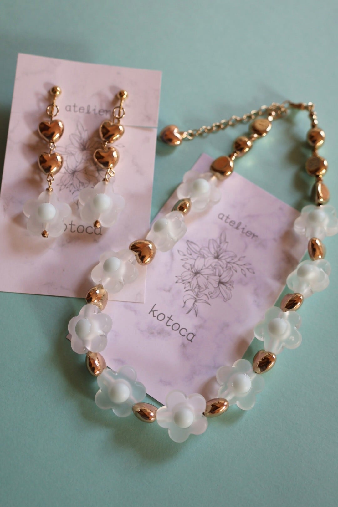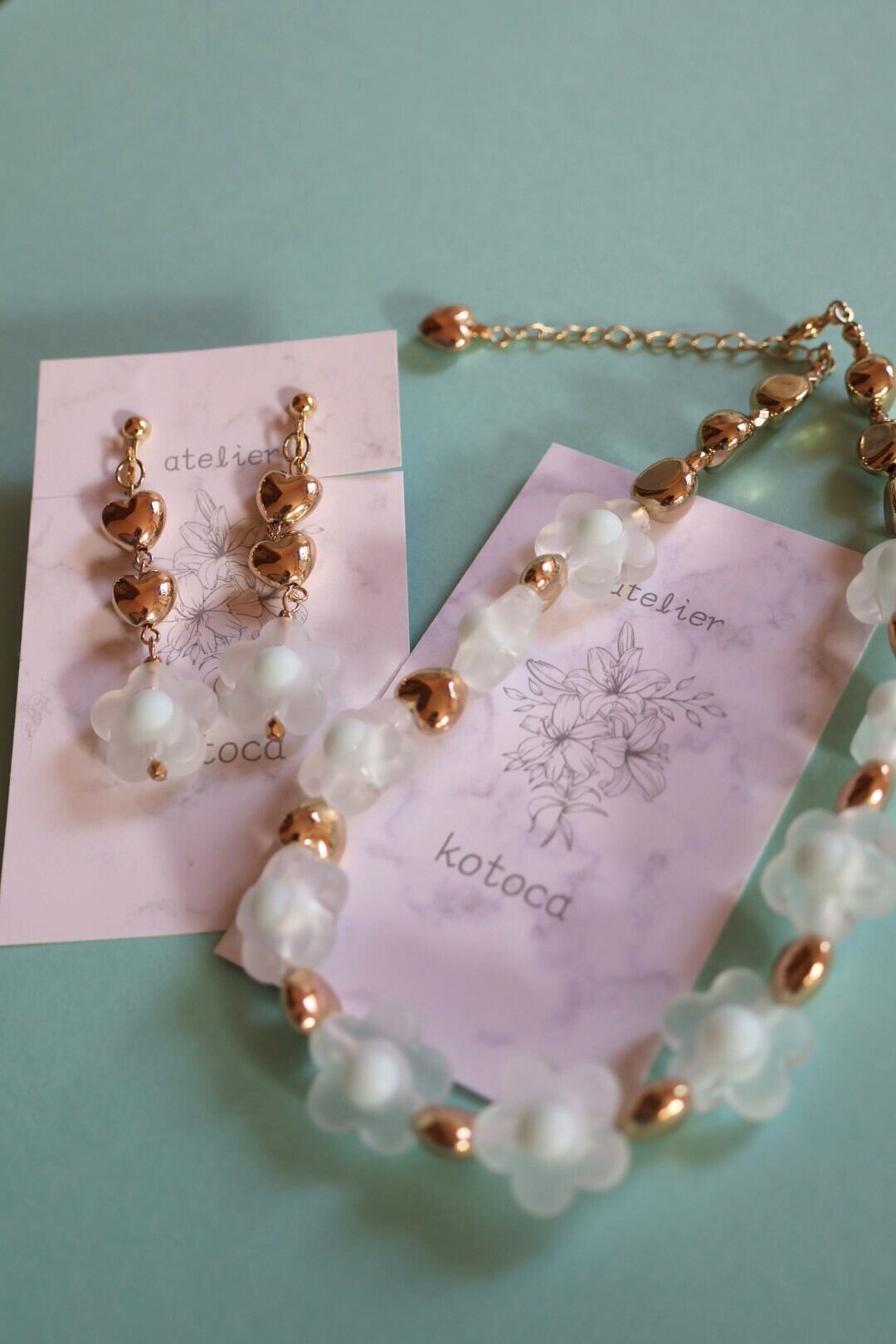 ふんわりマットなお花の可愛らしさとメタルなハートビーズを合わせて格好可愛く仕上げました❁