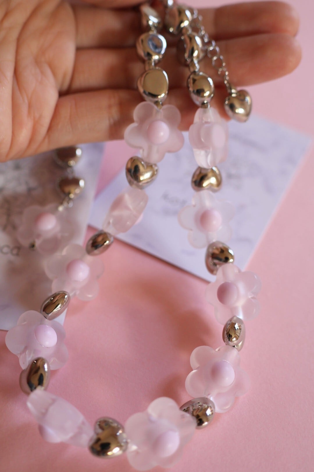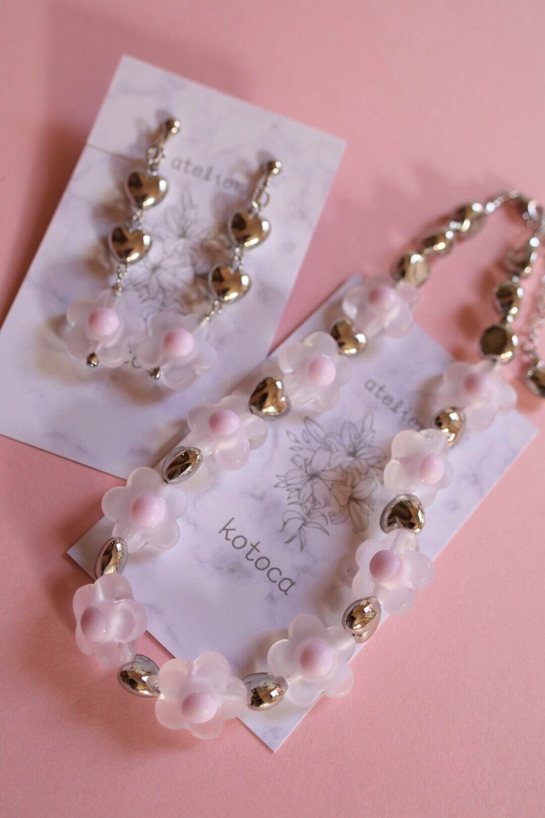 ふんわりマットなお花の可愛らしさとメタルなハートビーズを合わせて格好可愛く仕上げました❁